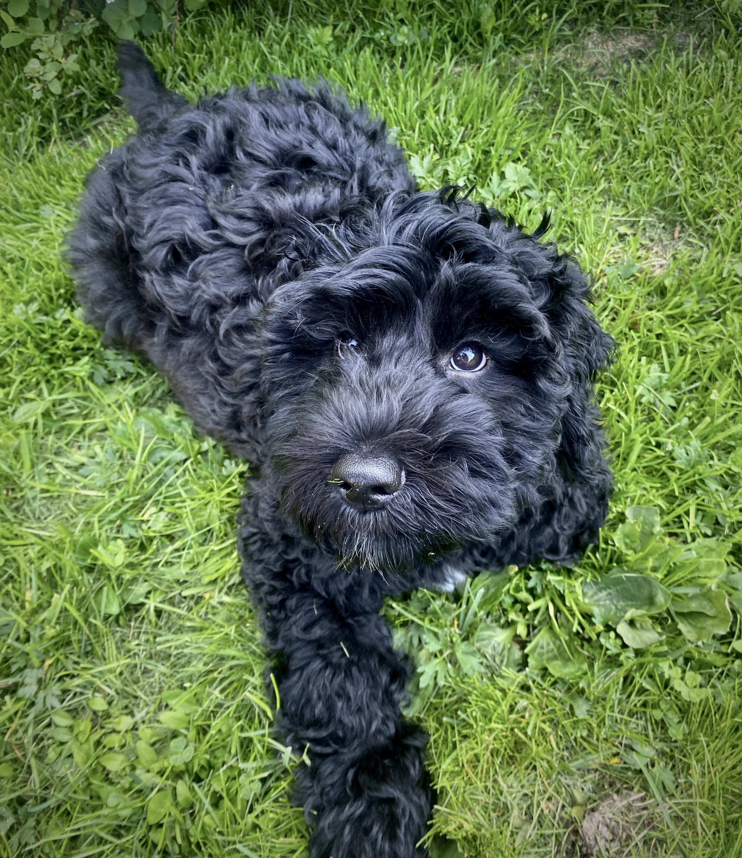 Sammy är en medium Australiensisk Labradoodle, svart fleecepäls med vita tecken.
